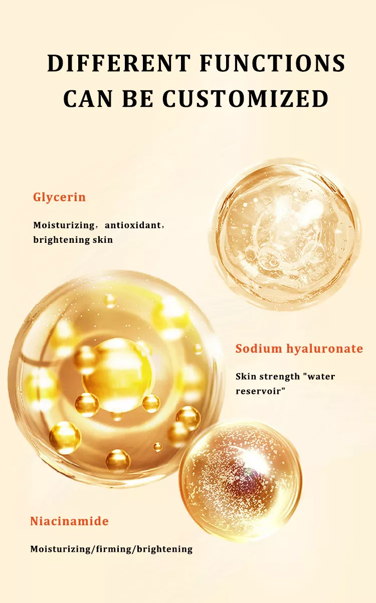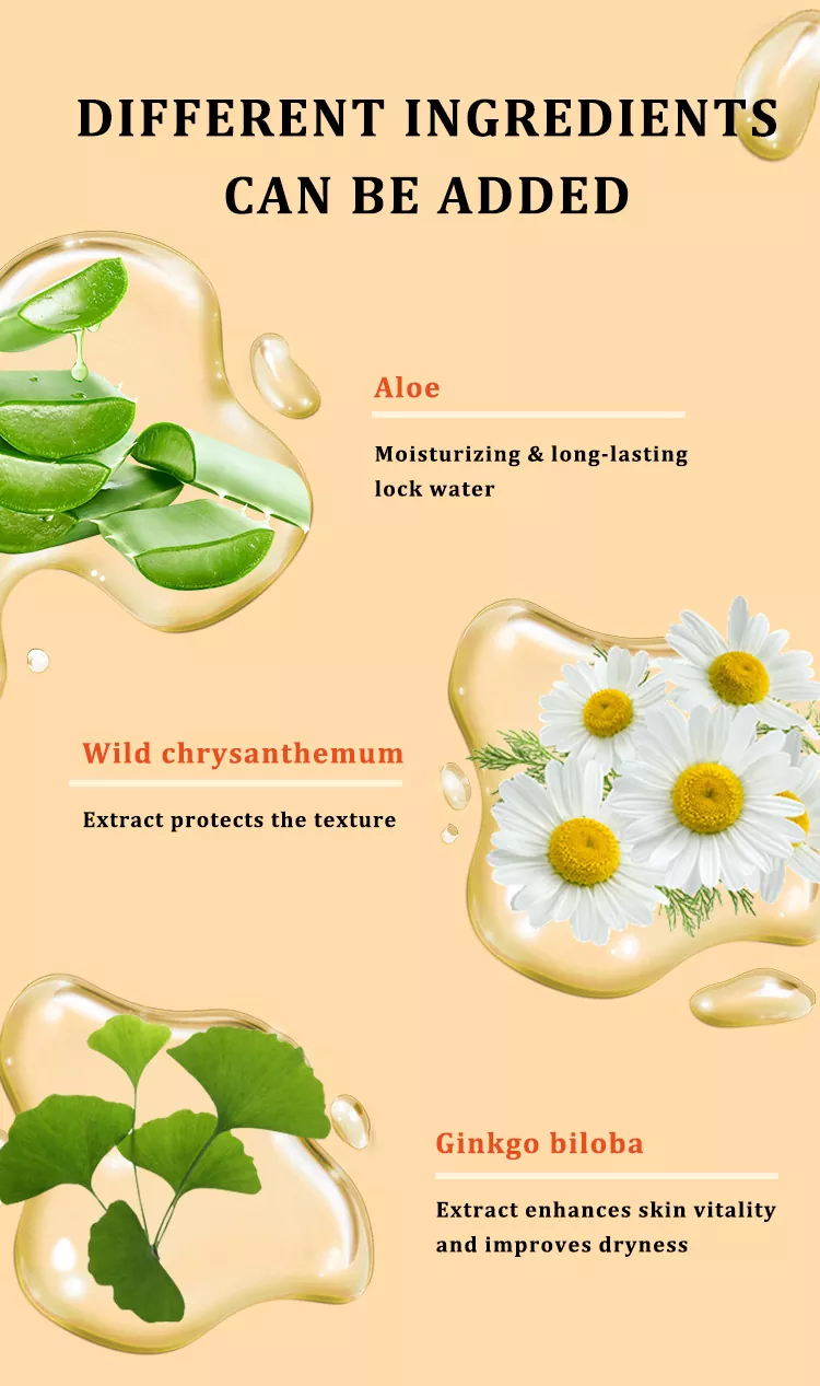 ما همچنین میتوانیم فرمول مورد نظر شما را بر اساس ترکیبات خاص محصول (مانند اسید هیالورونیک اصلی، نیاسینامید، ویتامین E، عصارههای گیاهی خاص، و غیره)، عطر (مانند گل رز، چای سفید، بدون عطر و غیره) و اینکه آیا اثرات ویژهای دارد (مانند ترمیم قوی، سفید کننده، سفتکننده و غیره) سفارشی کنیم.
